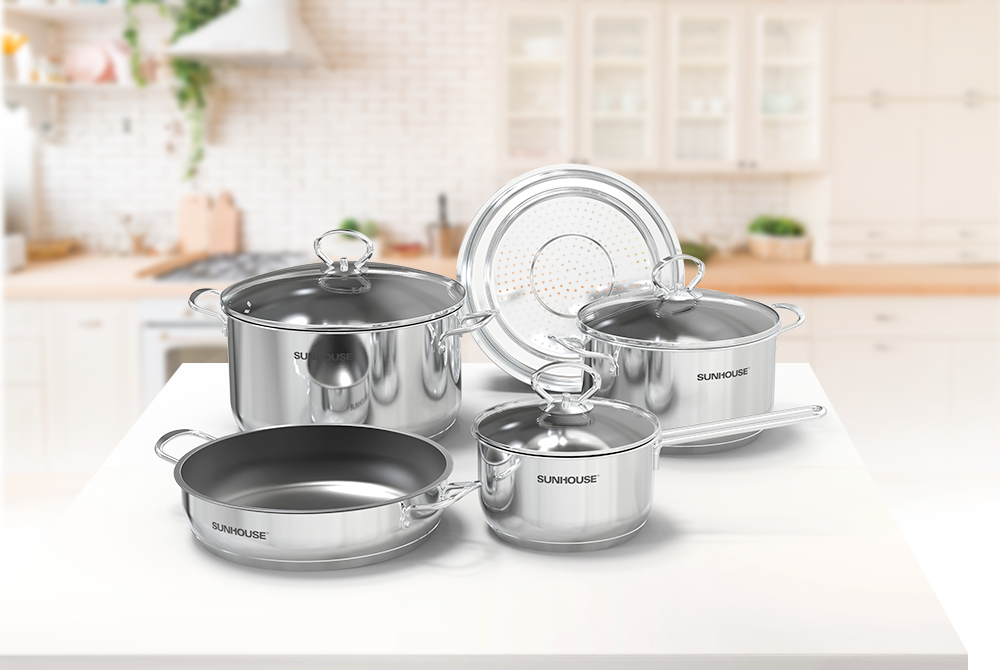 Bộ nồi chảo inox 5 món Easy Cook SUNHOUSE SHG996E sử dụng được với mọi loại bếp, kể cả bếp từ. Bộ sản phẩm gồm 01 quánh 16 cm, 02 nồi với đường kính 20 – 24 cm, 01 chảo 24 cm và 01 xửng hấp 24 cm phù hợp với nhu cầu nấu nướng của mọi gia đình. Quánh nhỏ 16cm thích hợp để luộc trứng, nấu mì, nấu cháo, nồi cỡ trung 20 – 24 cm để nấu canh, nấu lẩu cho 2 – 4 người và chảo 24 cm có chiên xào lượng thực phẩm lớn cho 3 – 5 người ăn. Ngoài ra, với xửng hấp 24 cm đi kèm, bạn sẽ dễ dàng hấp xôi, bánh bao, hâm nóng thức ăn và chế biến nhiều món ăn khác cho gia đình.