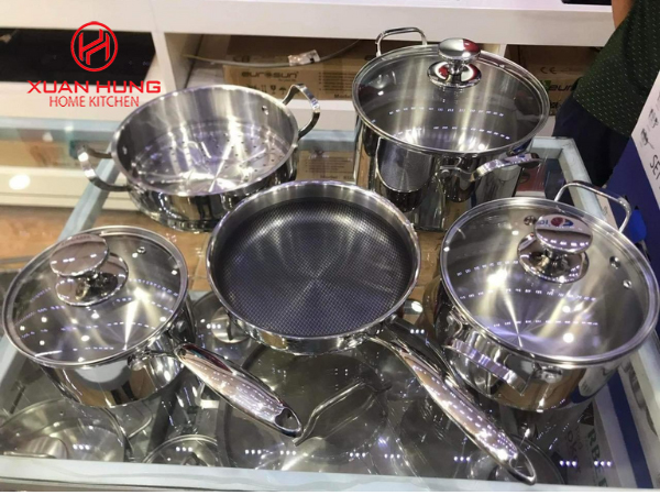 Bề mặt được đánh bóng bắt mắt chống bám vân tay, Bộ nồi thiết kế hình trụ, sử dụng vung kính chịu lực trong suốt, quan sát rõ khi đang đun nấu. Quai cầm gắn đinh tán chắc chắn không sợ bị gãy dụng trong quá trình dùng.
